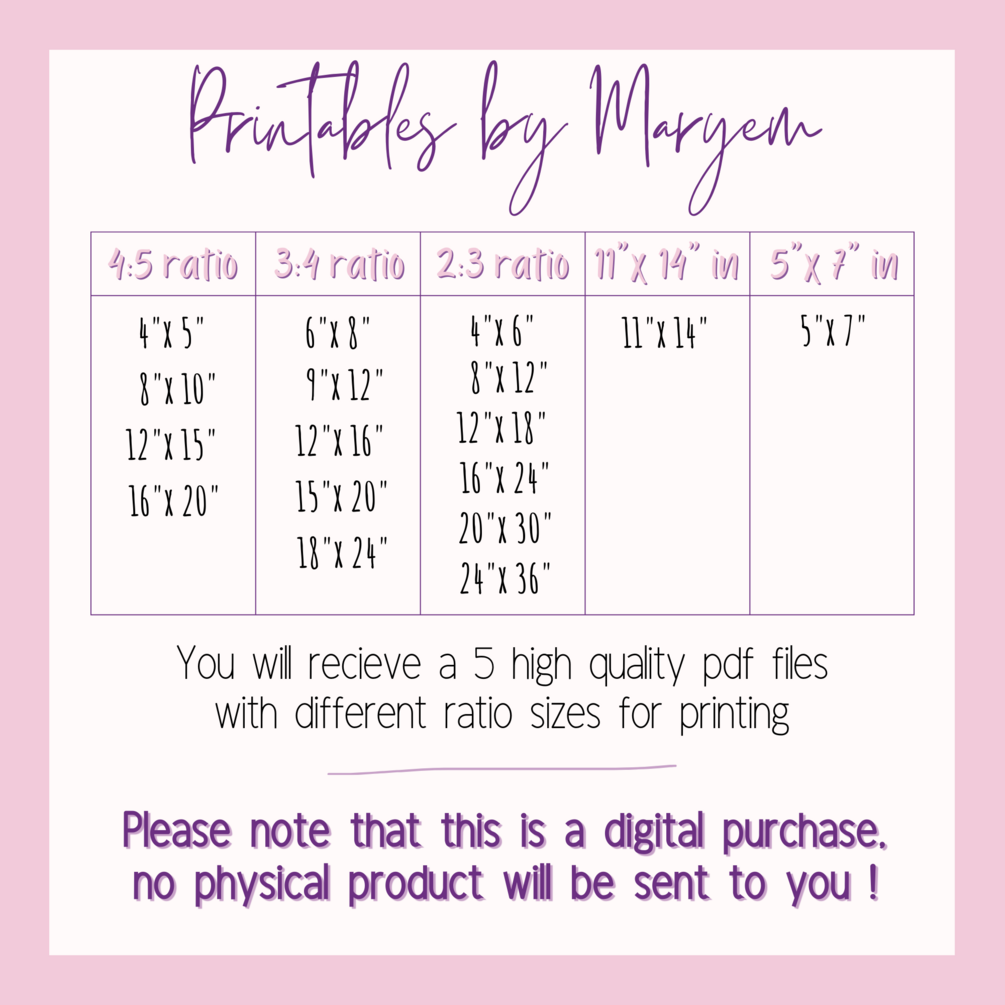 You'll get a five high quality pdf files with different ratio sizes for printing.